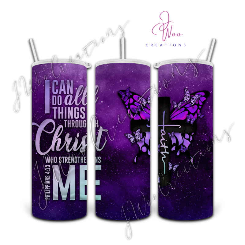 Introducing our Inspiration Tumbler line, this tumbler is a beautiful reminder of the power within you! Embrace your faith and stay inspired with this stunning tumbler featuring the powerful Bible verse, Phillippines 4:13. With its elegant design of purple butterflies against a black background, this tumbler is not only a stylish accessory but also a symbol of strength and resilience. Carry it with you wherever you go and let it serve as a constant reminder that with Christ, nothing is impossible.