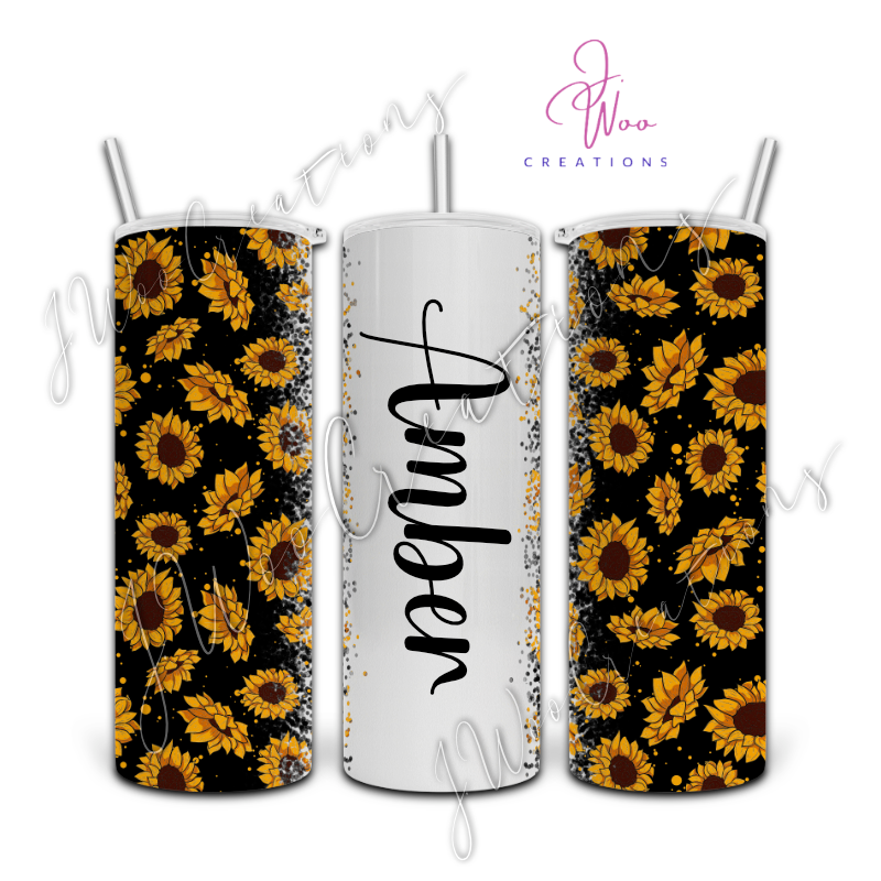 Our 20 oz. stainless steel tumbler is the perfect way to enjoy your drink in style. Its striking sunflower design on a black background is sure to display your unique personality, and you can even add your name to the cup for that extra touch of personalized sophistication. Luxurious and stylish, this tumbler is the perfect companion for any occasion. π»