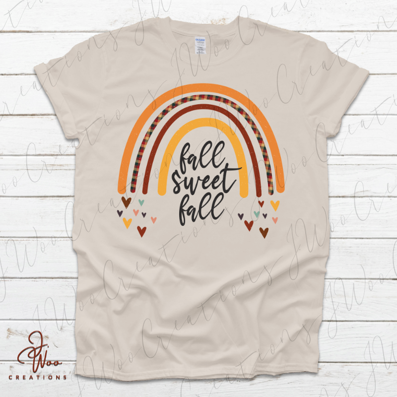 Whether you're enjoying pumpkin spice lattes or taking a stroll through colorful foliage, the Fall Sweet Fall (Rainbow) Tee is sure to become your go-to choice for effortless autumn style.