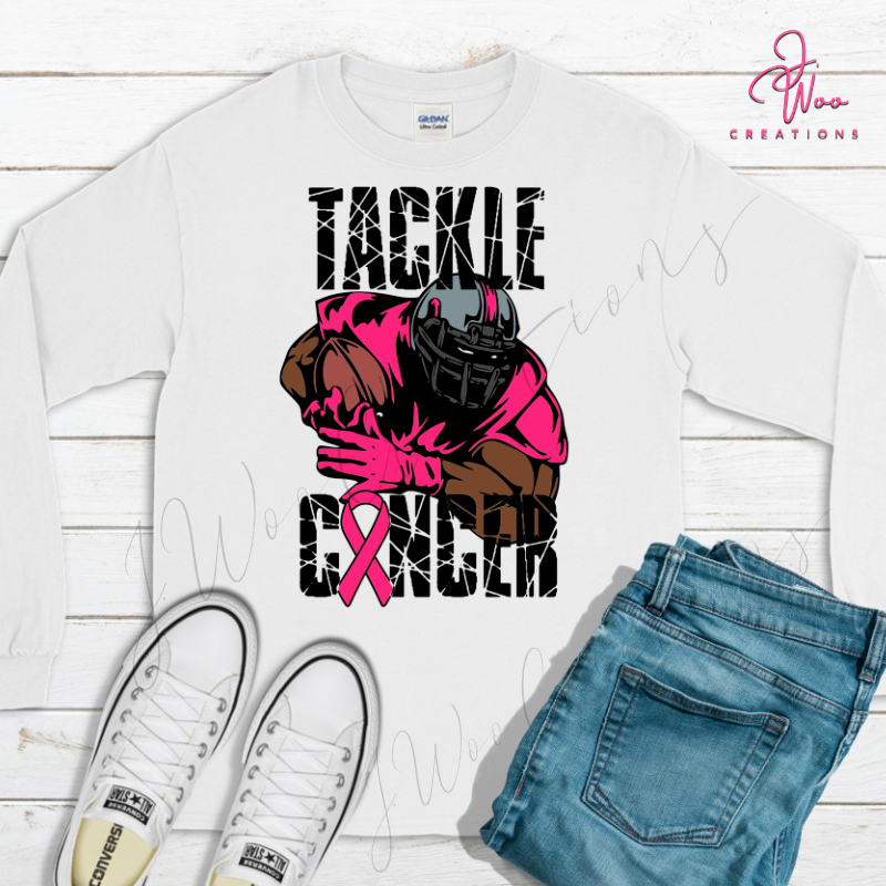 Introducing the Tackle Cancer Tee - a must-have shirt for all football fans and cancer fighters alike! Made from high-quality fabric, this shirt features a bold and empowering message that reads "Tackle Cancer" in large, vibrant letters. Accompanied by a football player graphic and a pink ribbon, this shirt is the perfect way to show your support for cancer awareness.